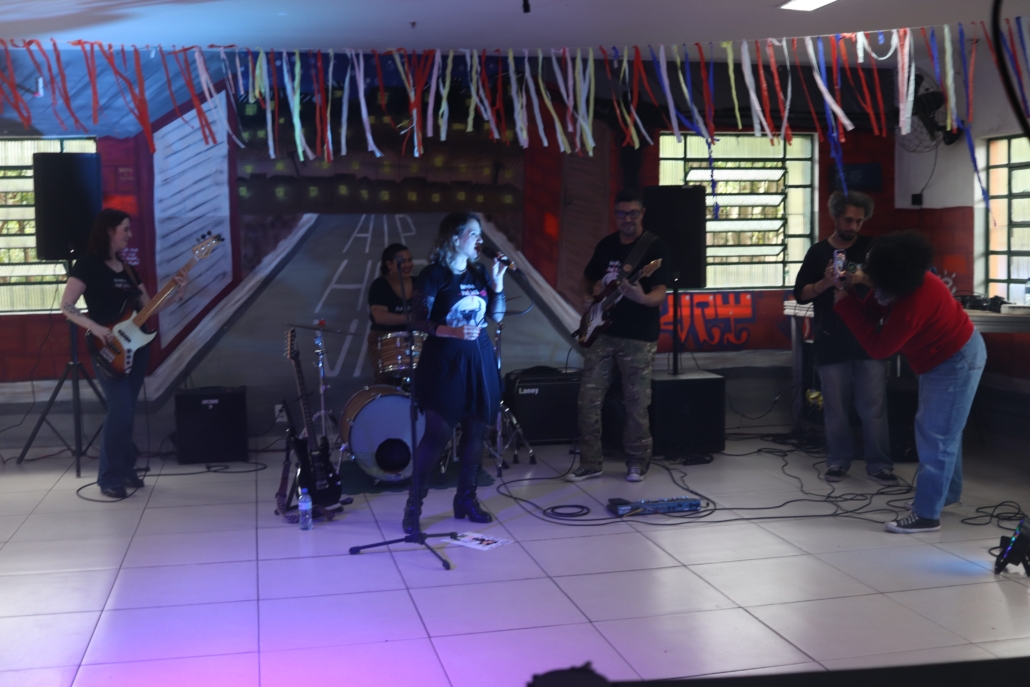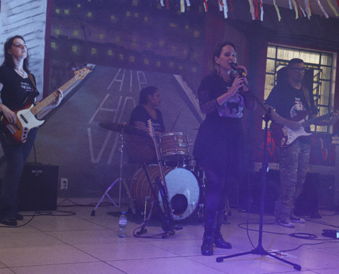 A banda D’Jorge, que é formada por alunos da Tech Art Musical — uma das parceiras do Palco Arteculando desde a primeira edição —, apresentou-se em um setlist de aproximadamente 45 minutos. A sonoridade do grupo, apesar de beber das influências do rock, foi bem diferente das outras apresentações: o balanço do reggae se fez presente em várias das músicas cantadas naquela tarde ensolarada da zona sul de São Paulo. O grupo é formado por quatro integrantes: Jorge Alves Filho (vocal), Júlia Seraphim (baixo), Alex Paixão (bateria) e João Victor Ferreira Souza (guitarra). Todos cantaram, com exceção do guitarrista.